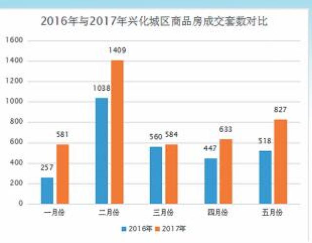在楼市里有一个说法叫“红五月”。5月的销量最能体现一个城市楼市的火热程度。如果“红五月”够红火,那么全年的销量基本都不会差。我们来横向对比近三年来兴化楼市5月份的销量,就能看出大致的趋势。2015年5月兴化城区成交商品房268套,成交金额1.81亿元;2016年5月兴化城区成交商品房518套,同比上涨93.3%,成交金额3.29亿元,同比上涨81.8%;2017年5月兴化城区成交商品房827套,同比上涨59.7%,房价也比去年同期上涨了11.2%。2017年5月城区商品房的销量竟然达到了2015年同期的3倍多。热销的态势非常明显。
