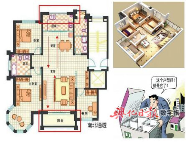 南北通透的户型通风和采光佳,三房以上要考虑双卧朝南,不是双卧朝南的就不是好房。不管你是大户型小户型,也不管是不是南北通透,你的客厅必须朝南,两居室也要考虑最起码有1个朝南。