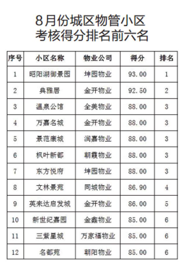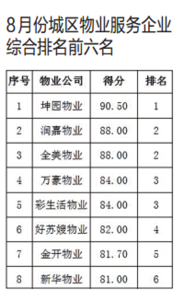 一、8月份城区考核排名前六名物业服务企业的名单如下:第一名坤园物业,得分90.5分;并列第二名的有润嘉物业、全美物业,得分88分;并列第三名的有万豪物业、彩生活物业,得分84分;第四名好苏嫂物业,得分82分;第五名金开物业,得分81.7分;第六名新华物业,得分81分。