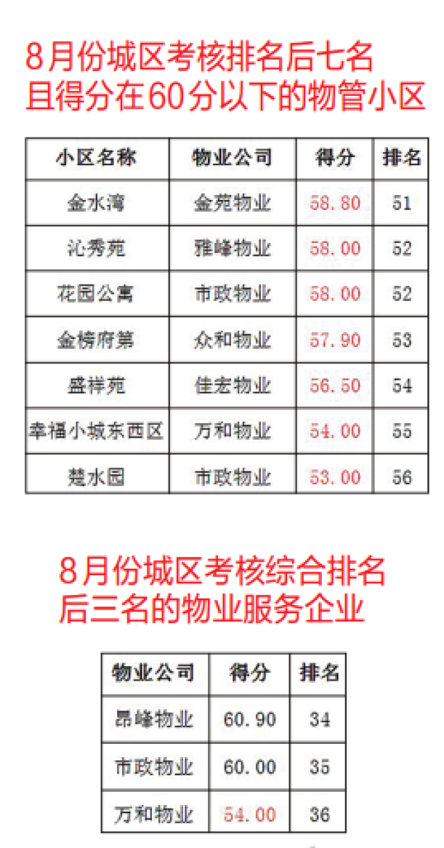 二、8月份城区考核排名得分在70分以下且倒数后三名的物业服务企业名单如下:昂峰物业,得分60.9分;市政物业,得分60分;万和物业,得分54分。