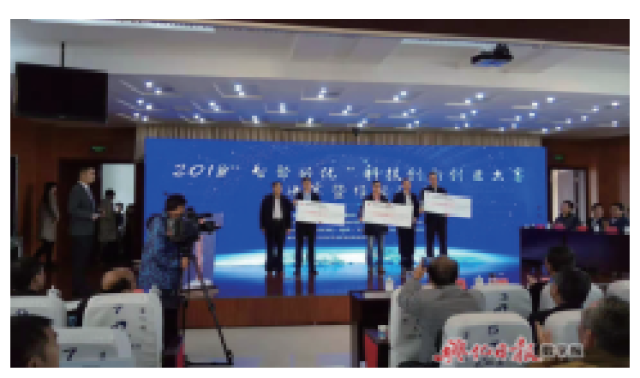 小陈故事工艺品有限公司总经理陈红兵(左二),荣获全市科技创新创业大赛一等奖。