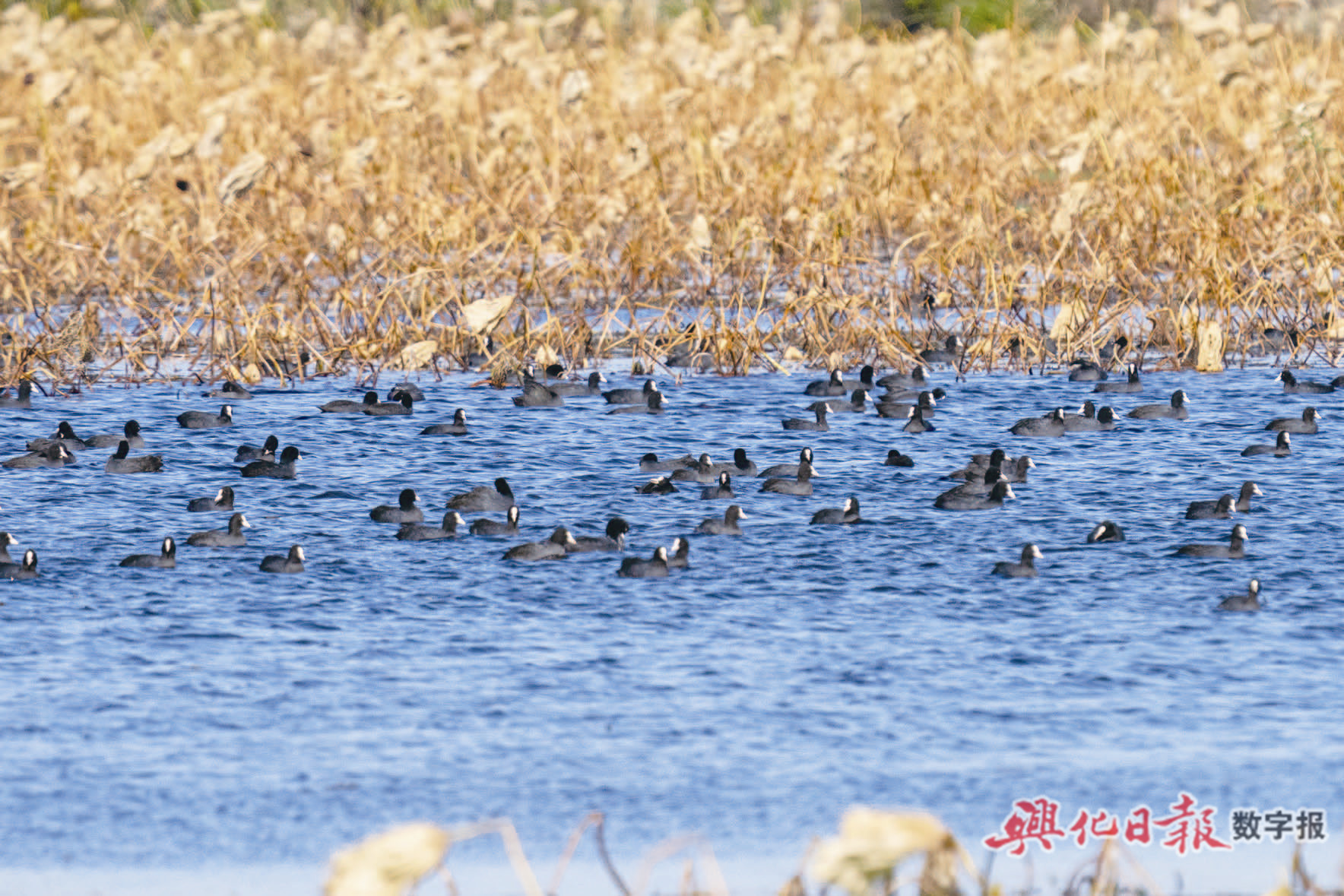 11月16日,千垛镇苏宋村,大群白骨顶鸡在湿地栖息、飞翔。白骨顶鸡是国家二级保护动物,对水质要求比较高,善游泳,又被称为“最会游泳的鸡”。