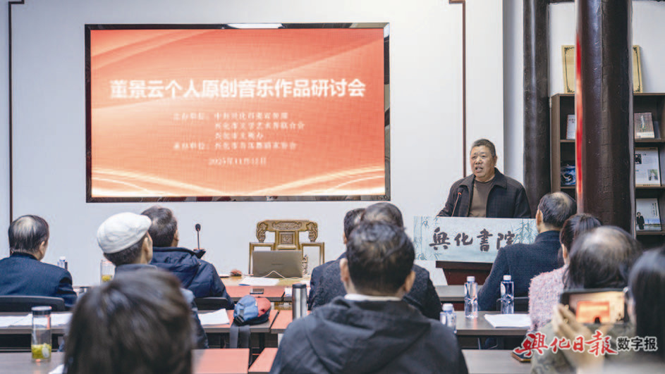 本报讯(通讯员 朱桂翔)近日,由市委宣传部、市文联、市文明办联合主办、市音乐舞蹈家协会承办的“农韵谱新曲·文旅歌兴声”董景云个人原创音乐作品研讨会在兴化书院明伦堂举办。