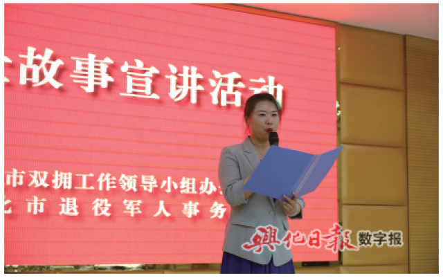“听了今天的烈士故事宣讲,使我思绪万千,我的大伯父是革命烈士,我的父亲、我本人以及我儿子三代人从过军,而且我儿子还在部队服役,这次在部队荣立三等功。我将把今天的活动告诉我儿子,要他安心在部队服役,要为祖国的国防事业再立新功。”来自戴南镇的现役军人家属代表徐松杰接受采访时说道。