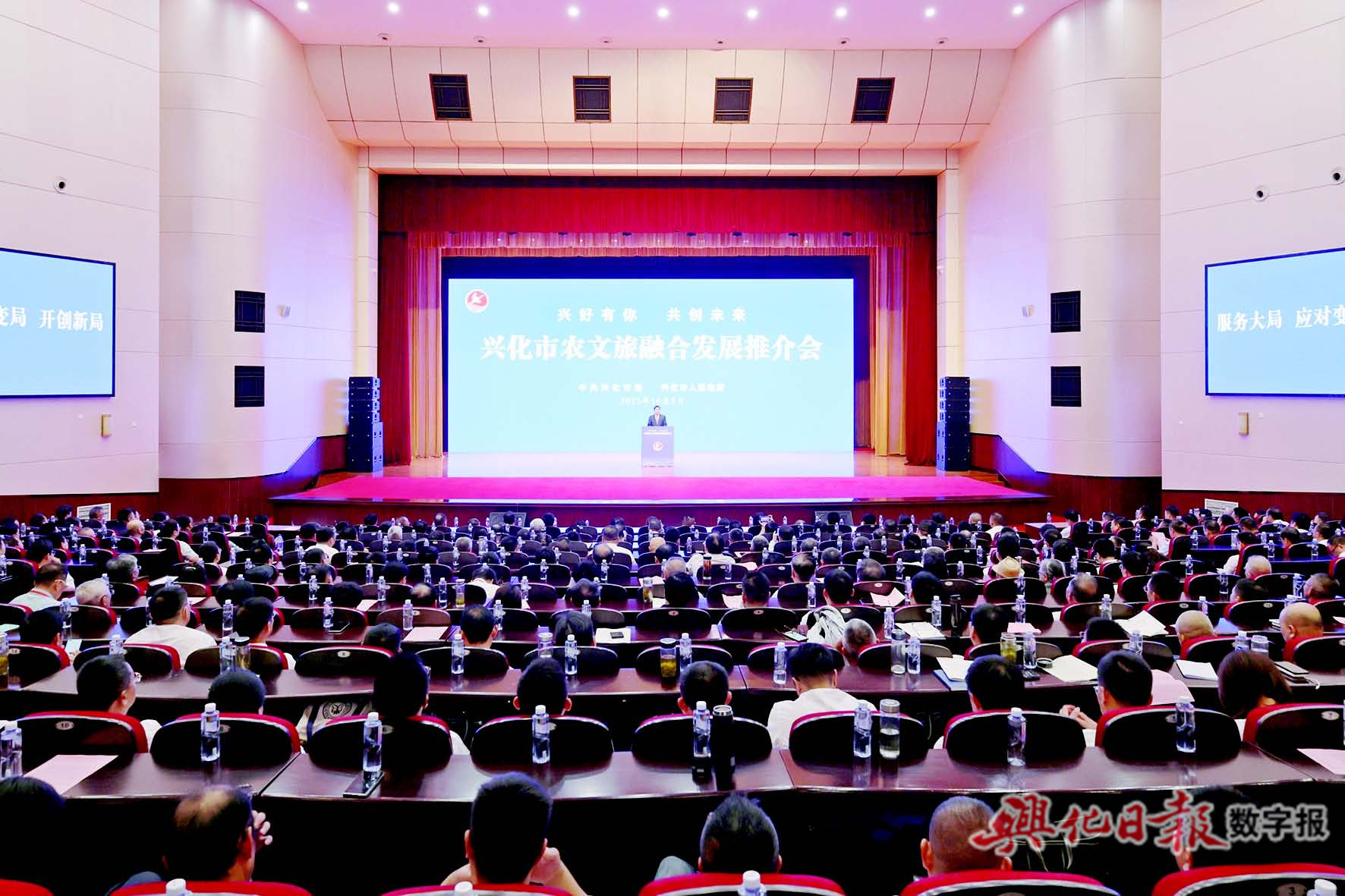 本报讯(全媒体记者 刘娟 汪翔 夏子轩)共叙兴化情,共谋新发展。10月5日上午,兴化市农文旅融合发展推介会在昭阳剧院举行。大会以“乡音乡情”为纽带,“农文旅融合”为主题,“推介交流”为载体,诚邀五湖四海的“兴化人”回归故里,共商发展大计、同创美好未来。市委书记陈锋剑出席会议并致辞。市委副书记、市长邵剑峰主持会议。市人大常委会主任沙顺喜、市政协主席徐立华等市四套班子全体负责人出席会议。